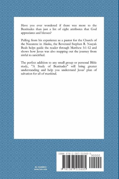 Have you ever wondered if there was more to the Beatitudes than just a list of eight attributes that God appreciates and blesses? Pulling from his experience as a pastor for the Church of the Nazarene in Alaska, the Reverand Stephen R. Naayak Beals helps guide the reader through Matthew 5:1-12 and shows how Jesus was also mapping out the journey from sinful to sanctified. The perfect addition to any small group or personal Bible study, "A Study of Beatitudes" will bring greater understanding and help you understand Jesus' plan of salvation for all of mankind.