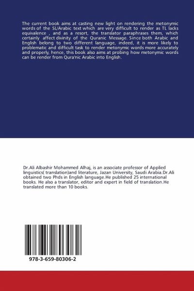 The current book aims at casting new light on rendering the metonymic words of the SL/Arabic text which are very difficult to render as TL lacks equivalence , and as a resort, the translator paraphrases them, which certainly affect divinity of the Quranic Message. Since both Arabic and English belong to two different language, indeed, it is more likely to problematic and difficult task to render metonymic words more accurately and properly, hence, this book also aims at probing how metonymic words can be render from Qura'nic Arabic into English.