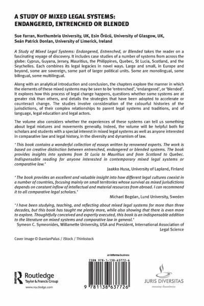 A Study of Mixed Legal Systems: Endangered, Entrenched, or Blended takes the reader on a fascinating voyage of discovery. It includes case studies of a number of systems from across the globe: Cyprus, Guyana, Jersey, Mauritius, Philippines, Quebec, St Lucia, Scotland, and Seychelles. Each combines its legal legacies in novel ways. Large and small, in Europe and beyond, some are sovereign, some part of larger political units. Some are monolingual, some bilingual, some multilingual. Along with an analytical introduction and conclusion, the chapters explore the manner in which the elements of these mixed systems may be seen to be 'entrenched', 'endangered', or 'blended'. It explores how this process of legal change happens, questions whether some systems are at greater risk than others, and details the strategies that have been adopted to accelerate or counteract change. The studies involve consideration of the colourful histories of the jurisdictions, of their complex relationships to parent legal systems and traditions, and of language, legal education and legal actors. The volume also considers whether the experiences of these systems can tell us something about legal mixtures and movements generally. Indeed, the volume will be helpful both for scholars and students with a special interest in mixed legal systems as well as anyone interested in comparative law and legal history, in the diversity and dynamism of law.