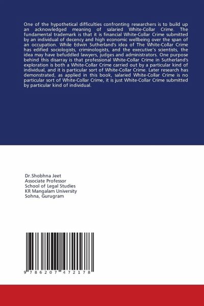 One of the hypothetical difficulties confronting researchers is to build up an acknowledged meaning of salaried White-Collar Crime. The fundamental trademark is that it is financial White-Collar Crime submitted by an individual of decency and high economic wellbeing over the span of an occupation. While Edwin Sutherland's idea of The White-Collar Crime has edified sociologists, criminologists, and the executive's scientists, the idea may have befuddled lawyers, judges and administrators. One purpose behind this disarray is that professional White-Collar Crime in Sutherland's exploration is both a White-Collar Crime carried out by a particular kind of individual, and it is particular sort of White-Collar Crime. Later research has demonstrated, as applied in this book, salaried White-Collar Crime is no particular sort of White-Collar Crime, it is just White-Collar Crime submitted by particular kind of individual.