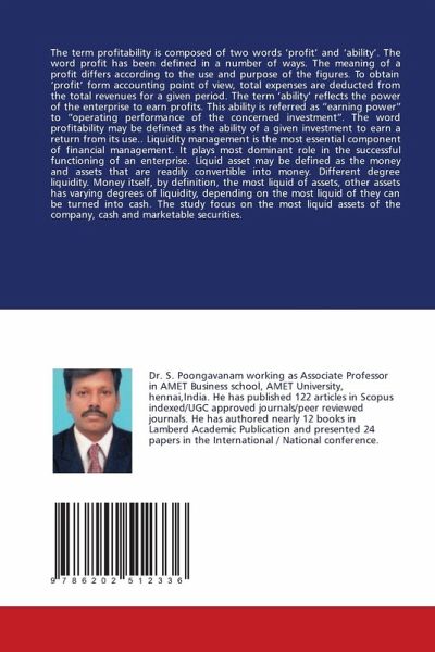 The term profitability is composed of two words 'profit' and 'ability'. The word profit has been defined in a number of ways. The meaning of a profit differs according to the use and purpose of the figures. To obtain 'profit' form accounting point of view, total expenses are deducted from the total revenues for a given period. The term 'ability' reflects the power of the enterprise to earn profits. This ability is referred as "earning power" to "operating performance of the concerned investment". The word profitability may be defined as the ability of a given investment to earn a return from its use.. Liquidity management is the most essential component of financial management. It plays most dominant role in the successful functioning of an enterprise. Liquid asset may be defined as the money and assets that are readily convertible into money. Different degree liquidity. Money itself, by definition, the most liquid of assets, other assets has varying degrees of liquidity, depending on the most liquid of they can be turned into cash. The study focus on the most liquid assets of the company, cash and marketable securities.