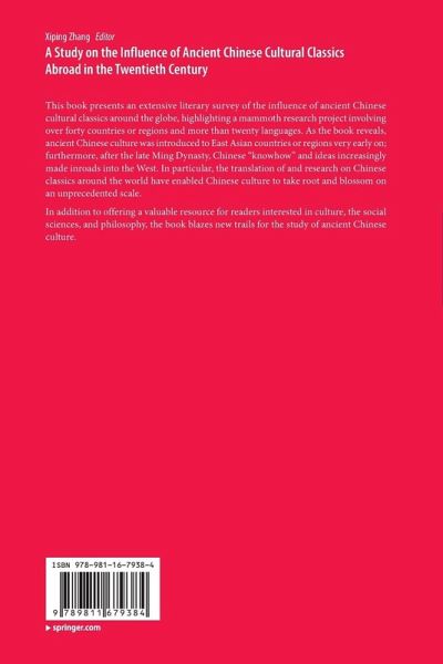 The Influence of Ancient Chinese Cultural Classics in Japan.- The Influence of Ancient Chinese Cultural Classics in South Korea.- The Influence of Ancient Chinese Cultural Classics in Southeast Asia.- The Influence of Ancient Chinese Cultural Classics in South Asia.- The Influence of Ancient Chinese Cultural Classics in England.