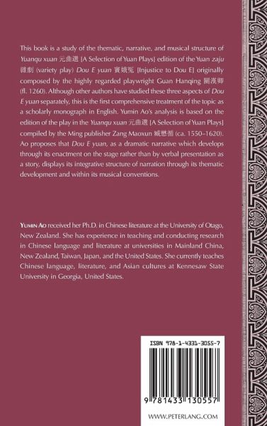 This book is a study of the thematic, narrative, and musical structure of Yuanqu xuan [A Selection of Yuan Plays] edition of the Yuan zaju (variety play) Dou E yuan [Injustice to Dou E] originally composed by the highly regarded playwright Guan Hanqing (fl. 1260). Although other authors have studied these three aspects of Dou E yuan separately, this is the first comprehensive treatment of the topic as a scholarly monograph in English. Yumin Ao's analysis is based on the edition of the play in the Yuanqu xuan [A Selection of Yuan Plays] compiled by the Ming publisher Zang Maoxun (ca. 1550-1620). Ao proposes that Dou E yuan, as a dramatic narrative which develops through its enactment on the stage rather than by verbal presentation as a story, displays its integrative structure of narration through its thematic development and within its musical conventions.