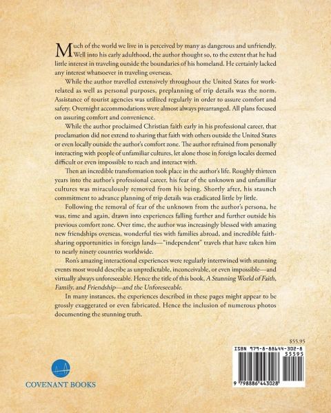Much of the world we live in is perceived by many as dangerous and unfriendly. Well into his early adulthood, the author thought so, to the extent that he had little interest in traveling outside the boundaries of his homeland. He certainly lacked any interest whatsoever in traveling overseas. While the author travelled extensively throughout the United States for work-related as well as personal purposes, preplanning of trip details was the norm. Assistance of tourist agencies was utilized regularly in order to assure comfort and safety. Overnight accommodations were almost always prearranged. All plans focused on assuring comfort and convenience. While the author proclaimed Christian faith early in his professional career, that proclamation did not extend to sharing that faith with others outside the United States or even locally outside the author's comfort zone. The author refrained from personally interacting with people of unfamiliar cultures, let alone those in foreign locales deemed difficult or even impossible to reach and interact with. Then an incredible transformation took place in the author's life. Roughly thirteen years into the author's professional career, his fear of the unknown and unfamiliar cultures was miraculously removed from his being. Shortly after, his staunch commitment to advance planning of trip details was eradicated little by little. Following the removal of fear of the unknown from the author's persona, he was, time and again, drawn into experiences falling further and further outside his previous comfort zone. Over time, the author was increasingly blessed with amazing new friendships overseas, wonderful ties with families abroad, and incredible faith-sharing opportunities in foreign lands--"independent" travels that have taken him to nearly ninety countries worldwide. Ron's amazing interactional experiences were regularly intertwined with stunning events most would describe as unpredictable, inconceivable, or even impossible--and virtually always unforeseeable. Hence the title of this book, A Stunning World of Faith, Family, and Friendship--and the Unforeseeable. In many instances, the experiences described in these pages might appear to be grossly exaggerated or even fabricated. Hence the inclusion of numerous photos documenting the stunning truth.