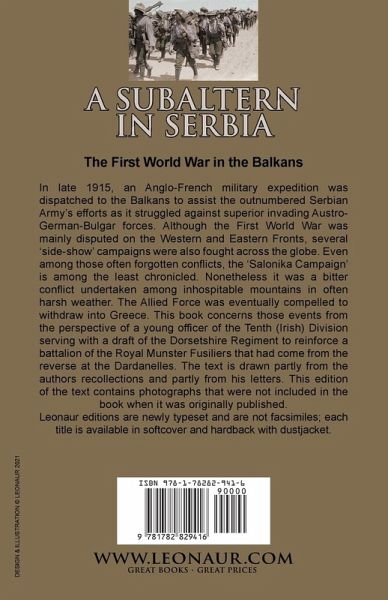 The First World War in the Balkans In late 1915, an Anglo-French military expedition was dispatched to the Balkans to assist the outnumbered Serbian Army's efforts as it struggled against superior invading Austro-German-Bulgar forces. Although the First World War was mainly disputed on the Western and Eastern Fronts, several 'side-show' campaigns were also fought across the globe. Even among those often forgotten conflicts, the 'Salonika Campaign' is among the least chronicled. Nonetheless it was a bitter conflict undertaken among inhospitable mountains in often harsh weather. The Allied Force was eventually compelled to withdraw into Greece. This book concerns those events from the perspective of a young officer of the Tenth (Irish) Division serving with a draft of the Dorsetshire Regiment to reinforce a battalion of the Royal Munster Fusiliers that had come from the reverse at the Dardanelles. The text is drawn partly from the authors recollections and partly from his letters. This edition of the text contains photographs that were not included in the book when it was originally published. Leonaur editions are newly typeset and are not facsimiles; each title is available in softcover and hardback with dustjacket.