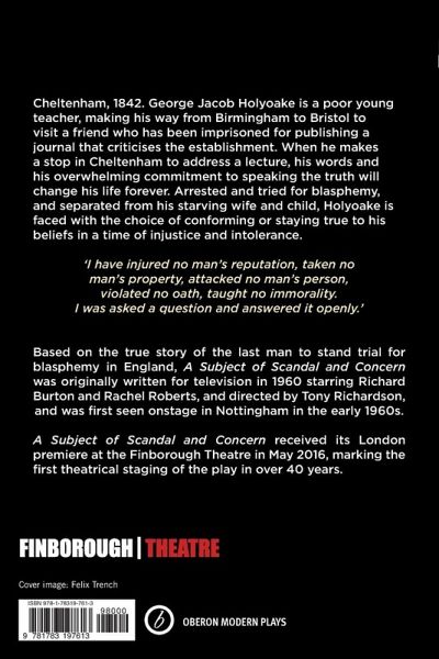 "I have injured no man's reputation, taken no man's property, attacked no man's person, violated no oath, taught no immorality. I was asked a question and answered it openly." Cheltenham, 1842. George Jacob Holyoake is a poor young teacher, making his way from Birmingham to Bristol to visit a friend who has been imprisoned for publishing a journal that criticises the establishment. When he makes a stop in Cheltenham to address a lecture, his words and his overwhelming commitment to speaking the truth will change his life forever. Arrested and tried for blasphemy, and separated from his starving wife and child, Holyoake is faced with the choice of conforming or staying true to his beliefs in a time of injustice and intolerance. Based on the true story of the last man to stand trial for blasphemy in England, A Subject Of Scandal And Concern was originally written for television in 1960 starring Richard Burton and Rachel Roberts, and directed by Tony Richardson, and was first seen onstage in Nottingham in the early 1960s. This production marks the first theatrical staging of the play in over 40 years and its long overdue London premiere. This volume also contains the short play Almost a Vision.