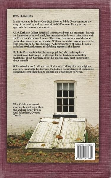 Finalist, 2015 IAN Awards for Historical Fiction. 1896, Philadelphia. In this stand alone sequel to "In Name Only" (2009 FQP), "A Subtle Grace" continues the story of the wealthy and unconventional O'Donovan Family as they approach the dawn of a new century. (Religious Fiction) At 19, Kathleen (oldest daughter) is unmarried with no prospects. Fearing the lonely fate of an old maid, her impatience leads to an infatuation with the first man who shows interest. The suave, handsome son of the local police chief seems a perfect match. But will her impulsive manner prevent her from recognizing her true beloved? A disturbing turn of events brings a dark shadow that threatens the life-long happiness she desires. Dr. Luke Peterson (the family's new physician) also makes quite an impression on Kathleen. His affection for her leads him to startling revelations: about Kathleen, about his practice and, most importantly, about himself. Will (oldest son) believes God may be calling him to a religious vocation. Eventually, he discovers the hidden circumstances of his humble beginnings compelling him to embark on a pilgrimage to Rome. Although 'A Subtle Grace' is the sequel to 'In Name Only,' each book can be read independently of the other.
