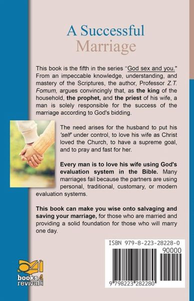 This book is the fifth in the series ''God sex and you." From an impeccable knowledge, understanding, and mastery of the Scriptures, the author, Professor Z.T. Fomum, argues convincingly that, as the king of the household, the prophet, and the priest of his wife, a man is solely responsible for the success of the marriage according to God's bidding. The need arises for the husband to put his 'self' under control, to love his wife as Christ loved the Church, to have a supreme goal, and to pray and fast for her. Every man is to love his wife using God's evaluation system in the Bible. Many marriages fail because the partners are using personal, traditional, customary, or modern evaluation systems. This book can make you wise onto salvaging and saving your marriage, for those who are married and providing a solid foundation for those who will marry one day.