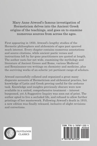 Mary Anne Atwood's famous investigation of Hermeticism delves into the Ancient Greek origins of the teachings, and goes on to examine numerous sources from across the ages. First appearing in 1850, Atwood's lengthy studies of the Hermetic philosophers and alchemists of ages past spurred much interest. Every chapter contains numerous annotations and source citations, while ancient poetic verses and instructions left by far-gone practitioners are quoted at length. The author casts her net wide, examining the mythology and literature of Ancient Greece and Rome, various Medieval and Renaissance-era writings on chemistry and medicine, plus the surviving works of an eclectic yet pertinent range of scholars. Atwood successfully collated and organized a great many disparate accounts of Hermeticism and alchemical practice, her knowledge of Latin and Greek proving useful for the arduous task. Knowledge and insights previously obscure were now available in a united, comprehensive treatment - interest burgeoned, yet A Suggestive Inquiry was soon out of print. The author opted to live a secluded life, and refused to allow further printings of her masterwork. Following Atwood's death in 1910, a new edition was finally released, inclusive of slight revisions and corrections.