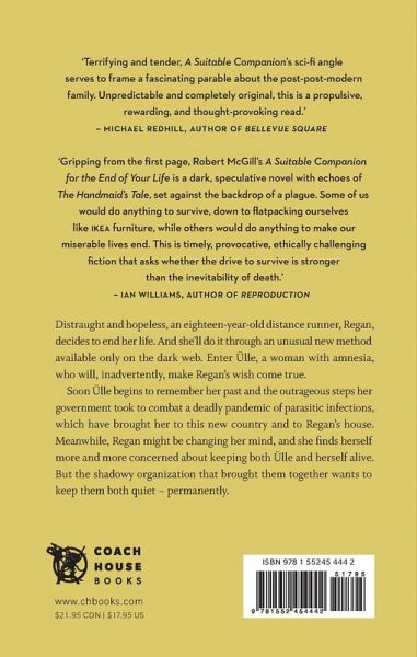 2022 QUILL & QUIRE BEST BOOKS OF THE YEAR SHORTLISTED FOR THE 30TH ANNUAL HAMILTON LITERARY FICTION AWARD A bold and absurd new take on the dystopian plague novel, where people are treated like IKEA furniture Distraught and hopeless, an eighteen-year-old distance runner, Regan, decides to end her life. And she’ll do it through an unusual new method available only on the dark web. Enter Ülle, a woman with amnesia, who will, inadvertently, make Regan’s wish come true. But Ülle begins to remember her past and the outrageous steps her government took to combat a deadly pandemic of parasitic infections, which have brought her to this new country and to Regan’s house. Meanwhile, Regan might be changing her mind, and she finds herself more and more concerned about keeping both Ülle and herself alive. But the shadowy organization that brought them together wants to keep them both quiet – permanently. A Suitable Companion for the End of Your Life is a darkly comic dystopian tale that probes our anxieties around boundaries, whether territorial or bodily, and our fraught desire not to die alone. "Gripping from the first page, Robert McGill’s A Suitable Companion for the End of Your Life is a dark, speculative novel with echoes of The Handmaid’s Tale, set against the backdrop of a plague. Some of us would do anything to survive, down to flatpacking ourselves like IKEA furniture, while others would do anything to make our miserable lives end. This is timely, provocative, ethically challenging fiction that asks whether the drive to survive is stronger than the inevitability of death." –Ian Williams, author of Reproduction "Terrifying and tender, A Suitable Companion's sci-fi angle serves to frame a fascinating parable about the post-post-modern family. Unpredictable and completely original, this is a propulsive, rewarding, and thought-provoking read." –Michael Redhill, author of Bellevue Square “The guy knows what he’s doing, from missing children to silk parachutes, you are never lost and he will catch you.” – Zadie Smith, author of Swing Time “A storyteller who refuses to keep things straight, and for this produces freshly captivating effects.” – Andrew Pyper, author of The Demonologist “A writer of striking talent and originality.” – Daily Mail on The Mysteries “McGill is a talented writer, adept at expressing the nuanced, unspoken truths that beg the lies by which we live.” – Observer on The Mysteries