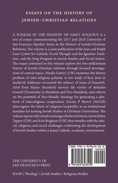 A Sukkah in the Shadow of Saint Ignatius is a trio of essays commemorating the 2017 and 2018 University of San Francisco Speaker Series in the History of Jewish-Christian Relations. The volume is a joint publication of the Joan and Ralph Lane Center for Catholic Social Thought and the Ignatian Tradition, and the Swig Program in Jewish Studies and Social Justice. The essays contained in this volume explore the two-millennium history of Jewish-Christian relations through focused investigations of central topics. Natalie Latteri (USF) examines the thorny problem of inter-religious polemic in her study of how Jews in medieval Ashkenaz recounted the infancy of Jesus of Nazareth. Ariel Evan Mayse (Stanford) surveys the variety of attitudes toward Christianity in Hasidism and Neo-Hasidism, and reflects on the potential of Neo-Hasidic theology for generating a platform of interreligious cooperation. Jeremy P. Brown (McGill) interrogates the limits of religious hospitality as an institutional mandate for hosting Jewish Studies at Christian Universities. The volume opens with a frank exchange of letters between Aaron Hahn Tapper (USF) and Erin Brigham (USF) that wrestles with the ethical, religious, and social challenges confronting the development of Jewish Studies within a Jesuit Catholic academic environment.