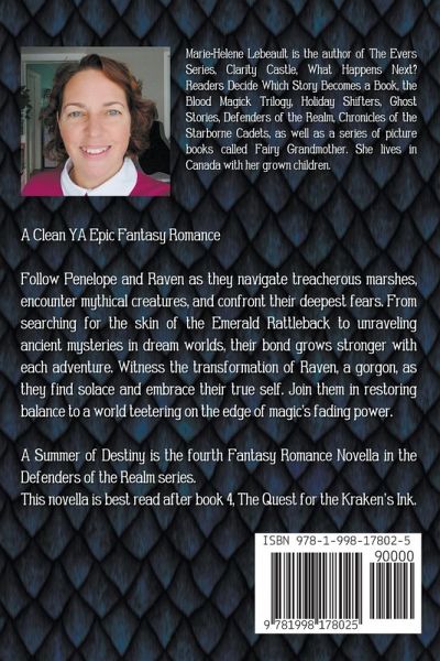Discover a tale where love and magic intertwine, as Penelope and Raven journey through mystical realms, facing their deepest fears and embracing their extraordinary destiny. A Clean YA Fantasy Romance Follow Penelope and Raven as they navigate treacherous marshes, encounter mythical creatures, and confront their deepest fears. From searching for the skin of the Emerald Rattleback to unraveling ancient mysteries in dream worlds, their bond grows stronger with each adventure. Witness the transformation of Raven, a gorgon, as they find solace and embrace their true self. Join them in restoring balance to a world teetering on the edge of magic's fading power. "A Summer of Destiny" is a tale that reminds us that destiny is not always what we expect, but true love and courage can overcome any challenge. A Summer of Destiny is the fourth Fantasy Romance Novella in the Defenders of the Realm series. This novella is best read after book 4, The Quest for the Kraken's Ink. Have you read the prequel? Read A Journey to Power!