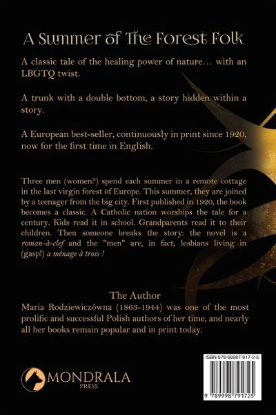 "Irresistibly charming. There's something of The Wind in the Willows, something of The Faggots and Their Friends Between Revolutions, something of Swallows and Amazons, and something uniquely its own as well," A Goodreads review. A cult classic tale of life in the forest, a European best-seller, never out of print, 52 editions in 102 years, now for the first time in English. Three women spend each summer in a remote cottage in the last virgin forest of Europe. This summer, they are joined by their teenage nephew from the big city. First published in 1920 as a story about three men, the book quickly became a classic because of its beautiful style, setting, humor and its heartwarming story. A literary nation has read it for a century. Kids have read it in school. Grandparents have read it to their children. Then, in 2014, a gay scholar caused a brouhaha: "The three men were in fact three lesbians!" Not that it matters all that much: this isn't really an LGBTQ novel. But knowing that the heroes are really heroines gives the book a special resonance: because it is a story about women choosing to live alone in the forest. Beautifully translated and illustrated to delight you. Come, let yourself be delighted. Maria Rodziewiczówna (1866-1944) was among the most successful Polish writers of the 20th century and almost all of her books remain in print today.
