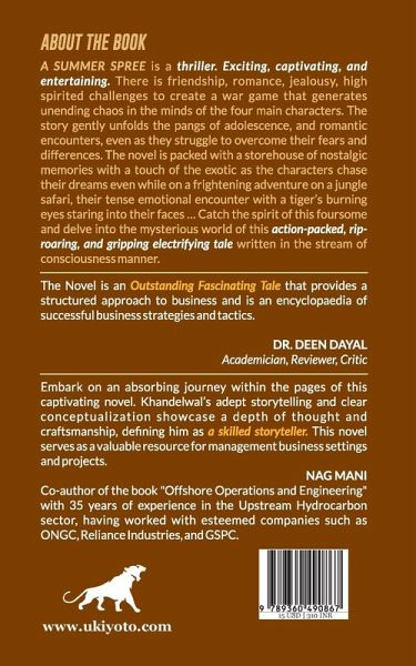 "A Summer Spree is a thriller. Exciting, captivating, and entertaining. There is friendship, romance, jealousy, high spirited challenges to create a war game that generates unending chaos in the minds of the four main characters. The story gently unfolds the pangs of adolescence, and romantic encounters, even as they struggle to overcome their fears and differences. The novel is packed with a storehouse of nostalgic memories with a touch of the exotic as the characters chase their dreams even while on a frightening adventure on a jungle safari, their tense emotional encounter with a tiger's burning eyes staring into their faces ... Catch the spirit of this foursome and delve into the mysterious world of this action-packed, rip-roaring, and gripping electrifying tale written in the stream of consciousness manner. "