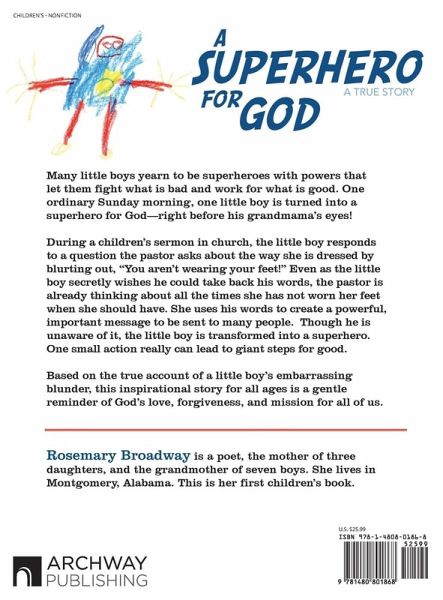 Many little boys yearn to be superheroes with powers that let them fight what is bad and work for what is good. One ordinary Sunday morning, one little boy is turned into a superhero for God-right before his grandmama's eyes! During a children's sermon in church, the little boy responds to a question the pastor asks about the way she is dressed by blurting out, "You aren't wearing your feet!" Even as the little boy secretly wishes he could take back his words, the pastor is already thinking about all the times she has not worn her feet when she should have. She uses his words to create a powerful, important message to be sent to many people. Though he is unaware of it, the little boy is transformed into a superhero. One small action really can lead to giant steps for good. Based on the true account of a little boy's embarrassing blunder, this inspirational story for all ages is a gentle reminder of God's love, forgiveness, and mission for all of us.