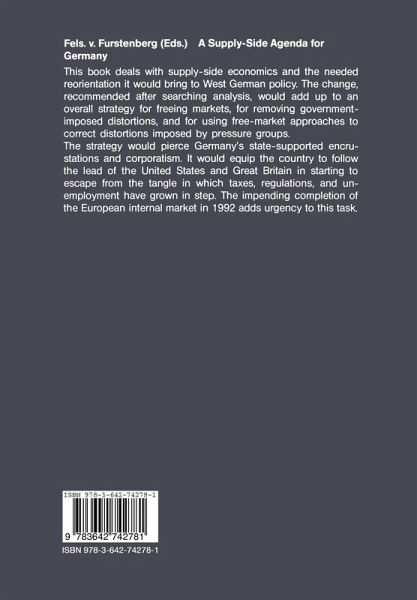 This book deals with supply-side economics and the needed reorientation it would bring to West German policy. The change, recommended after searching analysis, would add up to an overall strategy for freeing markets, for removing government-imposed distortions, and for using free-market approaches to correct distortions imposed by pressure groups. The strategy would pierce Germany's state-supported encrustations and corporatism. It would equip the country to follow the lead of the United States and Great Britain in starting to escape from the tangle in which taxes, regulations, and unemployment have grown in step. The impending completion of the European internal market in 1992 adds urgency to this task.