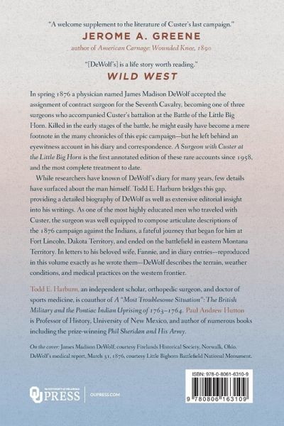 In spring 1876 a physician named James Madison DeWolf accepted the assignment of contract surgeon for the Seventh Cavalry, becoming one of three surgeons who accompanied Custer's battalion at the Battle of the Little Big Horn. Killed in the early stages of the battle, he might easily have become a mere footnote in the many chronicles of this epic campaign-but he left behind an eyewitness account in his diary and correspondence. A Surgeon with Custer at the Little Big Horn is the first annotated edition of these rare accounts since 1958, and the most complete treatment to date. While researchers have known of DeWolf's diary for many years, few details have surfaced about the man himself. In A Surgeon with Custer at the Little Big Horn, Todd E. Harburn bridges this gap, providing a detailed biography of DeWolf as well as extensive editorial insight into his writings. As one of the most highly educated men who traveled with Custer, the surgeon was well equipped to compose articulate descriptions of the 1876 campaign against the Indians, a fateful journey that began for him at Fort Lincoln, Dakota Territory, and ended on the battlefield in eastern Montana Territory. In letters to his beloved wife, Fannie, and in diary entries-reproduced in this volume exactly as he wrote them-DeWolf describes the terrain, weather conditions, and medical needs that he and his companions encountered along the way. After DeWolf's death, his colleague Dr. Henry Porter, who survived the conflict, retrieved his diary and sent it to DeWolf's widow. Later, the DeWolf family donated it to the Little Bighorn Battlefield National Monument. Now available in this accessible and fully annotated format, the diary, along with the DeWolf's personal correspondence, serves as a unique primary resource for information about the Little Big Horn campaign and medical practices on the western frontier.
