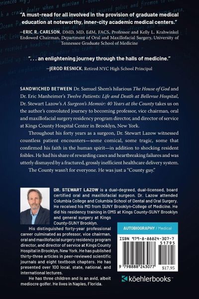 Sandwiched between Dr. Samuel Shem's hilarious The House of God and Dr. Eric Manheimer's Twelve Patients: Life and Death at Bellevue Hospital, Dr. Stewart Lazow's A Surgeon's Memoir: 40 Years at the County takes us on the author's convoluted journey to becoming professor, vice chairman, oral and maxillofacial surgery residency program director, and director of service at Kings County Hospital Center in Brooklyn, New York. Throughout his forty years as a surgeon, Dr. Stewart Lazow witnessed countless patient encounters-some comical, some tragic, some that confirmed his faith in the human spirit-in addition to shocking resident foibles. He had his share of rewarding cases and heartbreaking failures and was utterly dismayed by a fractured, grossly inefficient healthcare delivery system. The County wasn't for everyone. He was just a "County guy."
