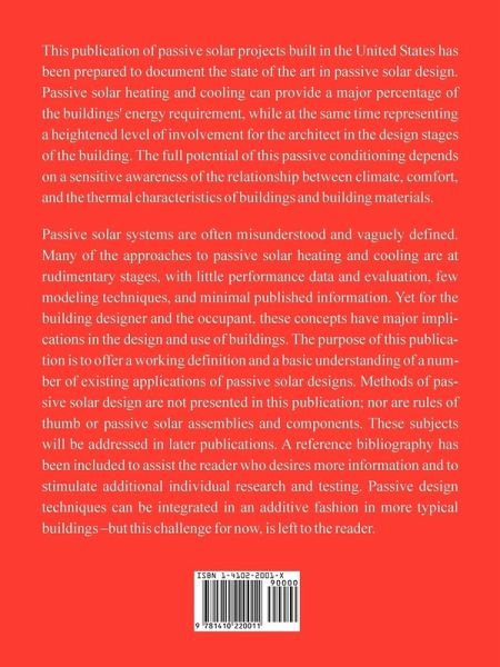 This publication of passive solar projects built in the United States has been prepared to document the state of the art in passive solar design. Passive solar heating and cooling can provide a major percentage of the buildings' energy requirement, while at the same time representing a heightened level of involvement for the architect in the design stages of the building. The full potential of this passive conditioning depends on a sensitive awareness of the relationship between climate, comfort, and the thermal characteristics of buildings and building materials. Passive solar systems are often misunderstood and vaguely defined. Many of the approaches to passive solar heating and cooling are at rudimentary stages, with little performance data and evaluation, few modeling techniques, and minimal published information. Yet for the building designer and the occupant, these concepts have major implications in the design and use of buildings. The purpose of this publication is to offer a working definition and a basic understanding of a number of existing applications of passive solar designs. Methods of passive solar design are not presented in this publication; nor are rules of thumb or passive solar assemblies and components. These subjects will be addressed in later publications. A reference bibliography has been included to assist the reader who desires more information and to stimulate additional individual research and testing. Passive design techniques can be integrated in an additive fashion in more typical buildings -but this challenge for now, is left to the reader.