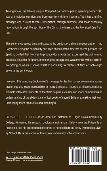 Among books, the Bible is unique. Compiled over a time period spanning some 1600 years, it includes contributions from over forty different writers. Yet it has a unified message and a clear theme--redemption through sacrifice, and most especially redemption through the sacrifice of the Christ, the Messiah, the Promised One from God. This coherence across time and space is the product of a single, unseen author--the Holy Spirit. Using the personality and style of each of the different sacred penmen, the Spirit so guided their work as to produce documents that expressed the divine mind precisely. Thus the Scripture, in the original autographs, was entirely without error in everything to which it spoke whether pertaining to matters of faith or fact--right down to the very words. However, this amazing book--God's message to the human race--remains rather mysterious and even inaccessible to many Christians. I hope that these summaries will help interested students of the Bible acquire a clearer and more comprehensive understanding of the sixty-six canonical books of sacred Scripture, making their own Bible study more productive and meaningful.
