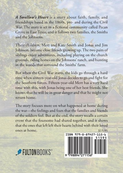 A Swallow's Heart is a story about faith, family, and friendships based in the 1860s, pre- and during the Civil War. The story is set in a fictional community called Pecan Grove in East Texas, and it follows two families, the Smiths and the Johnsons. Their children, Mert and Kate Smith and Jonas and Jim Johnson, become close friends growing up. The two pairs of siblings enjoy adventures, including playing on the church grounds, riding horses on the Johnsons' ranch, and hunting in the woods that surround the Smiths' farm. But when the Civil War starts, the kids go through a hard time when sixteen-year-old Jonas decides to go and fight for the Southern forces. Fifteen-year-old Mert has a very hard time with this, with Jonas being one of her best friends. She knows that he will be in great danger and that he might not return home. The story focuses more on what happened at home during the war--the feelings and fears that the families and friends of the soldiers feel. But at the end, the story recalls a certain event that the foursome had shared together, and it shows that the ones that left left their hearts behind with their loved ones at home.