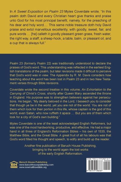 Myles Coverdale translated this essay from Martin Luther in 1537. Poetic and profound, Luther expounded Psalm 23 in accordance with now-forgotten but centuries-old understanding that it was written about the word of God. Coverdale wrote, "In this psalm doth David and every Christian heart give thanks and praise unto God for his most principal benefit, namely, for the preaching of his dear and holy word... [he] calleth it goodly pleasant green grass, fresh water, the right way, a staff, a sheep-hook, a table, balm, or pleasant oil, and a cup that is always full." Baruch House is now giving this work back to the world in modern spelling, to recover the lost interpretation of Psalm 23. The Appendix by R. M. Davis shows how the loss of the traditional interpretation began with John Calvin's commentary on Psalm 23. Calvin rather shockingly taught that David's riches and honour were "ladders to God." He said nothing about God's word. Then the Geneva Bible changed Psalm 23 to refer to resting in pastures beside still waters, instead of feeding in a pasture with refreshing water, as it was in the Matthew Bible (and the other early English Bibles). Also, the new notes in the Geneva Bible said nothing about God's word. Later Bibles followed the Geneva translation of Psalm 23, and thus the ancient understanding was lost. The Appendix compares the translation and notes of the Matthew Bible with those of the Geneva version so that people can see the changes for themselves. As well, Calvin's full commentary is attached. Included also in this volume is Coverdale's essay, "An Exhortation to the Carrying of Christ's Cross." He wrote it shortly after Queen Mary ascended the throne in England, to strengthen believers against her persecutions. It is timely today, where Christianity is coming under attack.