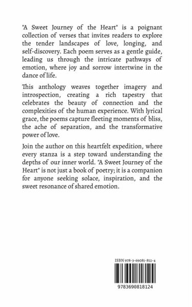 "A Sweet Journey of the Heart" is a poignant collection of verses that invites readers to explore the tender landscapes of love, longing, and self-discovery. Each poem serves as a gentle guide, leading us through the intricate pathways of emotion, where joy and sorrow intertwine in the dance of life. This anthology weaves together imagery and introspection, creating a rich tapestry that celebrates the beauty of connection and the complexities of the human experience. With lyrical grace, the poems capture fleeting moments of bliss, the ache of separation, and the transformative power of love. Join the author on this heartfelt expedition, where every stanza is a step toward understanding the depths of our inner world. "A Sweet Journey of the Heart" is not just a book of poetry; it is a companion for anyone seeking solace, inspiration, and the sweet resonance of shared emotion.