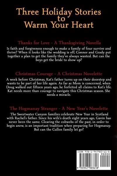 This holiday trio contains three stories featuring beloved characters from the Sweetwater Canyon series. Thanks for Love – A Thanksgiving Novella Is faith and forgiveness enough to make a family of four survive and thrive? After Sarah’s horrific ordeal with Amanda, all she wanted was to be in Tom’s arms forever. But now she’s not sure she is the best person to bring this family together. When it looks like the wedding is off, Connor and Grady put together a plan to get the family they’ve always wanted. A Thanksgiving Day wedding, with all of Broken Bow in attendance is in jeopardy. Can the boys get the bride to show up? Christmas Courage – A Christmas Novelette A week before Christmas, Kat’s father turns up on their doorstep and wants to be a part of her life. As far as Theresa is concerned, when Doug walked out fifteen years ago, leaving her with a two-year-old child and a mountain of debt, he forfeited all claims to Kat’s life. He does not get to waltz in like Santa Claus and re-claim her. Kat needs more than courage to navigate this Christmas season. She needs a miracle. The Hogmanay Stranger – A New Year’s Novelette The Sweetwater Canyon musicians celebrate Hogmanay in Scotland with Rachel’s father, Gavin Cullen. Since his wife’s death eight years ago, Gavin has never been the same. Running the bed and breakfast inn is what has kept him going. When a young, homeless stranger is given a room in the inn on New Year’s Eve, he’s met with great caution. Clearing the cobwebs of the past in order to begin anew is a tradition at Hogmanay, but can the Cullen family let go?