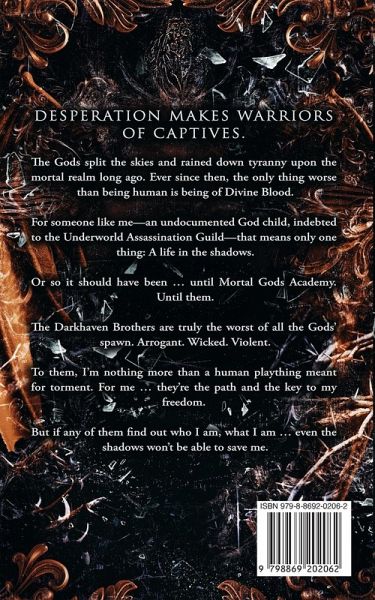 Desperation makes warriors of captives. The Gods split the skies and rained down tyranny upon the mortal realm long ago. Ever since then, the only thing worse than being human is being of Divine Blood. For someone like me-an undocumented God child, indebted to the Underworld Assassination Guild-that means only one thing: A life in the shadows. Or so it should have been ... until Mortal Gods Academy. Until them. The Darkhaven Brothers are truly the worst of all the Gods' spawn. Arrogant. Wicked. Violent. To them, I'm nothing more than a human plaything meant for torment. For me ... they're the path and the key to my freedom. But if any of them find out who I am, what I am ... even the shadows won't be able to save me.