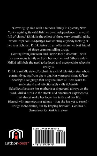 "Growing up rich with a famous family in Queens, New York - a girl gotta establish her own independence in a world full of chaos." Rhikki is the oldest of three very beautiful girls whom Papi call LaddyBugs. Not wanting anybody looking at her as a rich girl, Rhikki takes up an offer from her best friend of three years on selling drugs. Coming from Jamaican and Puerto Rican descents - with an enormous family on both her mother and father's side - Rhikki still feels the need to be loved and accepted for who she really is. Rhikki's middle sister, Porchuh, is a child television star who's constantly going from gig to gig. Her youngest sister, Ky'Ree, develops a language that only the three of them learn to understand and affectionately calls it Jamish. Rebellious because her mother is a singer and always on the road, Rhikki turns to the streets and encounter experiences that almost make her loose her faith and her life. Blessed with numerous of talents that she has yet to reveal brings more drama, but by keeping her faith God has A Symphony for Rhikki in store.