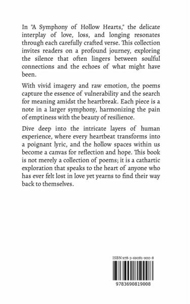 In "A Symphony of Hollow Hearts," the delicate interplay of love, loss, and longing resonates through each carefully crafted verse. This collection invites readers on a profound journey, exploring the silence that often lingers between soulful connections and the echoes of what might have been. With vivid imagery and raw emotion, the poems capture the essence of vulnerability and the search for meaning amidst the heartbreak. Each piece is a note in a larger symphony, harmonizing the pain of emptiness with the beauty of resilience. Dive deep into the intricate layers of human experience, where every heartbeat transforms into a poignant lyric, and the hollow spaces within us become a canvas for reflection and hope. This book is not merely a collection of poems; it is a cathartic exploration that speaks to the heart of anyone who has ever felt lost in love yet yearns to find their way back to themselves.