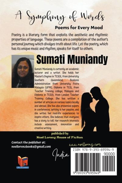 Poetry is a literary form that exploits the aesthetic and rhythmic properties of language. These poems are a compilation of the author's personal journey which divulges truth about life. Let the poetry, which has its unique music and rhythm, speaks for itself to others. Sumati Muniandy is currently an academic lecturer and a writer. She holds her Master's Degree in TESOL from University Southern Queensland, Business Administration from University Putra Malaysia (UPM), Diploma in TESL from Teacher Training college, Malaysia and Diploma in TESOL from London Teacher Training College. She has written a number of articles on various topics locally and abroad. She has also presented papers in conferences. Writing is her passion, and she writes her real-life experiences to inspire others. She believes that everyone has a story to tell. Her research interests include assessment, innovation and creative writing.
