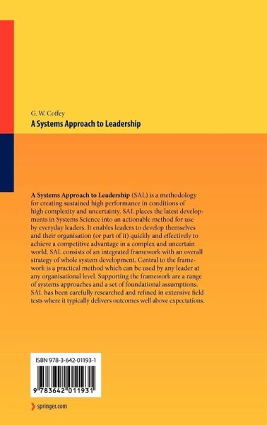 "A Systems Approach to Leadership" (SAL) is a methodology for creating sustained high performance in conditions of high complexity and uncertainty. SAL places the latest developments in Systems Science into an actionable method for use by everyday leaders. It enables leaders to develop themselves and their organisation (or part of it) quickly and effectively to achieve a competitive advantage in a complex and uncertain world. SAL consists of an integrated framework with an overall strategy of whole system development. Central to the framework is a practical method which can be used by any leader at any organisational level. Supporting the framework are a range of systems approaches and a set of foundational assumptions. SAL has been carefully researched and refined in extensive field tests where it typically delivers outcomes well above expectations.