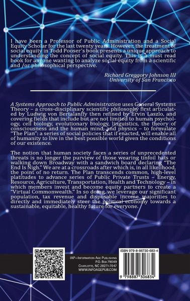 A Systems Approach to Public Administration uses General Systems Theory - a cross-disciplinary scientific philosophy first articulated by Ludwig von Bertalanffy then refined by Ervin Laszlo, and covering fields that include but are not limited to human psychology, cell biology, evolutionary biology, linguistics, the theory of consciousness and the human mind, and physics - to formulate "The Plan": a series of social policies that if enacted, will enable all of humanity to live in the best possible world given the conditions of our existence. The notion that human society faces a series of unprecedented threats is no longer the purview of those wearing tinfoil hats or walking down Broadway with a sandwich board declaring "The End Is Nigh." We are at a crossroads after which is, in all likelihood, the point of no return. The Plan transcends common, high-level platitudes to advance series of Public Private Trusts - Energy, Resource, Agriculture, Transportation, Health and Technology - in which members invest and become equity partners to create a "Virtual Commonwealth." In so doing, we leverage our significant population, tax revenue and disposable income majorities to directly and immediately steer the political economy towards a sustainable, equitable, healthy future for everyone.