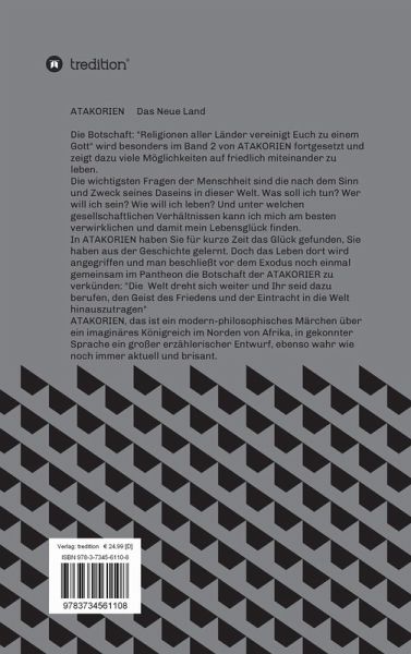 Die Botschaft: "Religionen aller Länder vereinigt Euch zu einem Gott" wird besonders im Band 2 von ATAKORIEN fortgesetzt und zeigt dazu viele Möglichkeiten auf friedlich miteinander zu leben.Die wichtigsten Fragen der Menschheit sind die nach dem Sinn und Zweck seines Daseins in dieser Welt. Was soll ich tun? Wer will ich sein? Wie will ich leben? Und unter welchen gesellschaftlichen Verhältnissen kann ich mich am besten verwirklichen und damit mein Lebensglück finden.In ATAKORIEN haben die Menschen für kurze Zeit das Glück gefunden. Sie haben aus der Geschichte gelernt. Doch das Leben dort wird angegriffen und man beschließt vor dem Exodus noch einmal gemeinsam im Pantheon die Botschaft der ATAKORIER zu verkünden: "Die Welt dreht sich weiter und Ihr seid dazu berufen, den Geist des Friedens und der Eintracht in die Welt hinauszutragen"ATAKORIEN, das ist ein modern-philosophisches Märchen über ein imaginäres Königreich im Norden von Afrika. In gekonnter Sprache ein großer erzählerischer Entwurf, ebenso wahr wie noch immer aktuell und brisant.