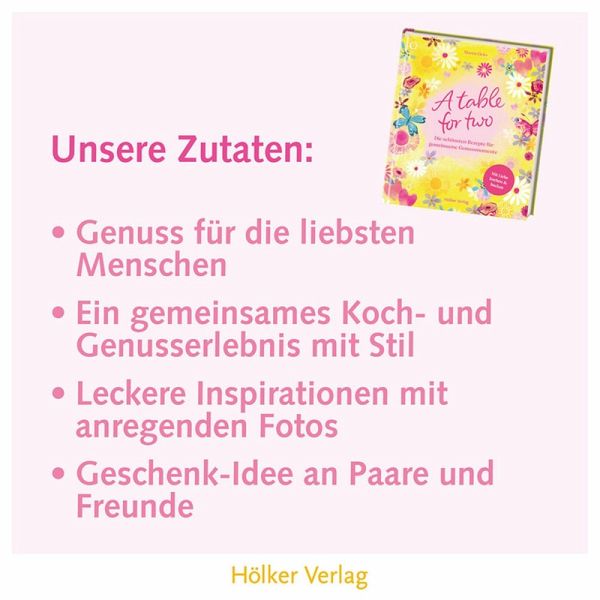Kochen, lachen, genießen - A table for two macht aus gemeinsamen Mahlzeiten besondere Momente. Ob aromatisches Peanut-Curry, mediterrane Gemüsequiche, verführerisches Himbeer-Vanille-Parfait oder prickelnder Mango-Maracuja-Fizz - dieses liebevoll gestaltete Kochbuch bietet 28 vielseitige Rezepte für Zweisamkeit, Freunde oder kleine Feiern. Mit farbenfrohen Illustrationen und wunderschönen Fotos ausgestattet, ist es ein echter Genuss für alle Sinne und perfekt für ein unvergessliches Beisammensein mit den liebsten Menschen.