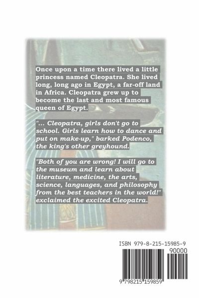 Once upon a time there lived a little princess named Cleopatra. She lived long long ago in Egypt, a far-off land in Africa. Cleopatra grew up to become the last and most famous queen of Egypt. "... Cleopatra, girls don't go to school. Girls learn how to dance and put on make-up," barked Podenco, the king's other greyhound. "Both of you are wrong! I will go to the museum and learn about literature, medicine, the arts, science, languages, and philosophy from the best teachers in the world!" exclaimed the excited Cleopatra.