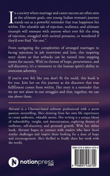 In a society where marriage and career success are often seen as the ultimate goals, one young Indian woman's journey stands out as a powerful reminder that true happiness lies within. Her relatable tale of rejection, resilience, and ultimate triumph will resonate with anyone who's ever felt the sting of rejection, struggled with societal pressures, or wondered if they'd ever find "the one.". From navigating the complexities of arranged marriages to facing rejections in job interviews and love, this inspiring story shows us that setbacks can be turned into stepping stones for success. With its themes of hope, perseverance, and self-discovery, it's a testament to the human spirit's ability to overcome adversity. If you've ever felt like you don't fit the mold, this book is for you. Join her on this journey as she discovers that true fulfillment comes from within. Her story is a reminder that we are not alone in our struggles and that, together, we can rise above them.