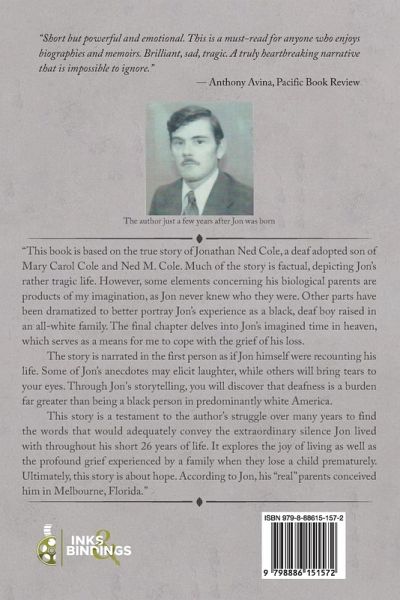 "This book is based on the true story of Jonathan Ned Cole, a deaf adopted son of Mary Carol Cole and Ned M. Cole. Much of the story is factual, depicting Jon's rather tragic life. However, some elements concerning his biological parents are products of my imagination, as Jon never knew who they were. Other parts have been dramatized to better portray Jon's experience as a black, deaf boy raised in an all-white family. The final chapter delves into Jon's imagined time in heaven, which serves as a means for me to cope with the grief of his loss. The story is narrated in the first person as if Jon himself were recounting his life. Some of Jon's anecdotes may elicit laughter, while others will bring tears to your eyes. Through Jon's storytelling, you will discover that deafness is a burden far greater than being a black person in predominantly white America. This story is a testament to the author's struggle over many years to find the words that would adequately convey the extraordinary silence Jon lived with throughout his short 26 years of life. It explores the joy of living as well as the profound grief experienced by a family when they lose a child prematurely. Ultimately, this story is about hope. According to Jon, his "real" parents conceived him in Melbourne, Florida."