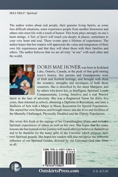The author writes about real people, their genuine living Spirits, as some face difficult situations, some experience people from another dimension and others who meet life with a touch of humor. This book plays strongly on one's heart strings. A Tale of Spirit will touch you deeply in places, sometimes to your very heart and soul. These events span a lifetime of experiences. The author hopes that her readers will appreciate the value and uniqueness of their own life experiences and that they will share these with their families and others. The author believes that we are all truly "at one" with each other and the world.