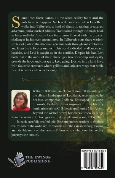 Sometimes there comes a time when reality fades and the unbelievable happens. Such is the moment when Levi Reid walks into Telbereth, a land of fantastic talking creatures, adventure, and a touch of whimsy. Transported through the magic book in his grandfather's study, Levi finds himself faced with the greatest challenges he has ever encountered. In Telbereth, stars share wisdom while evil plots in the shadows; centaurs walk through ancient forests; and fauns live in forever summer. This world is divided by alliances and loyalties, and Levi is caught up in the conflict. Despite his fear, Levi finds that in the midst of these challenges, true friendship and loyalty provide the hope and courage to keep going. Journey into a land filled with fantastic creatures where griffins and unicorns wage war while Levi determines where he belongs.