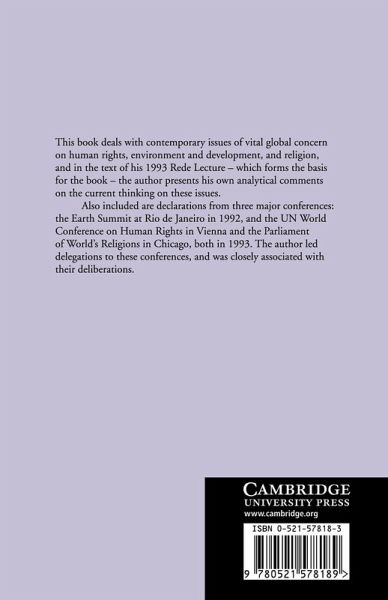 This book deals with contemporary issues of vital global concern on human rights, environment and development, and religion. In the text of his 1993 Rede Lecture - which forms the basis for the book - the author presents his own analytical comments on current thinking on these issues. Also included are declarations from three major conferences: the Earth Summit at Rio de Janeiro in 1992; the UN World Conference on Human Rights in Vienna, 1993; and the Parliament of World Religions in Chicago, 1993. The author led delegations to these conferences, and was closely associated with their deliberations.