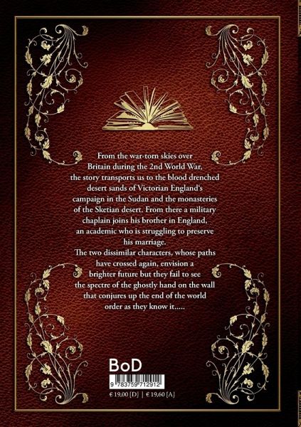 From the war-torn skies over Britain during the 2nd World War, the story transports us to the blood drenched desert sands of Victorian England's campaign in the torrid Sudan and the monasteries of the Sketian desert, from which a military chaplain joins his brother in England, an academic who is struggling to preserve his marriage. The two dissimilar characters, whose paths have crossed again, envision a brighter future but they fail to see the spectre of the ghostly hand on the wall that conjures up the end of the world order as they know it.....