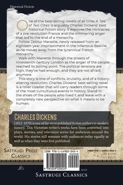 Read one of the greatest classics of all time.The definitive edition.Features an extended biography of the life and experiences of Charles Dickens Large Print editions available in hardback and paperback One of the best-selling novels of all time, A Tale of Two Cities is arguably Charles Dickens' best historical fiction stories. It explores the intricacies of a pre-revolution France and the simmering anger that led to the end of a monarchy. Follow Doctor Manette, newly released from an eighteen-year imprisonment in the infamous Bastille, as he moves away from the tyrannical French monarchy."Liberty, Equality, Fraternity, or Death!" Walk with Manette through the streets of nineteenth-century London as the anger of the people reached its boiling point. The political tensions are high, they've had enough, and they are not afraid anymore. This story is one of conflicts, brutality, and of a history-altering revolution. Charles Dickens' best-selling novel is a roller coaster that will carry readers through some of the most tumultuous events in history. Stand in the shoes of the people who lived it and leave with a completely new perspective on what it means to be human.