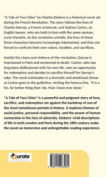 "A Tale of Two Cities" by Charles Dickens is a historical novel set during the French Revolution. The story follows the lives of Charles Darnay, a French aristocrat, and Sydney Carton, an English lawyer, who are both in love with the same woman, Lucie Manette. As the revolution unfolds, the lives of these three characters become increasingly intertwined, and they are forced to confront their own values, loyalties, and sacrifices. Amidst the chaos and violence of the revolution, Darnay is imprisoned in Paris and sentenced to death. Carton, who has long been disillusioned with his own life, sees an opportunity for redemption and decides to sacrifice himself for Darnay's sake. The novel culminates in a dramatic and emotional climax as Carton goes to the guillotine, reciting the famous line, "It is a far, far better thing that I do, than I have ever done." "A Tale of Two Cities" is a powerful and poignant story of love, sacrifice, and redemption set against the backdrop of one of the most tumultuous periods in history. It explores themes of social justice, personal responsibility, and the power of human connection in the face of adversity. Dickens' vivid descriptions of life in both London and Paris during the 18th century make the novel an immersive and unforgettable reading experience.
