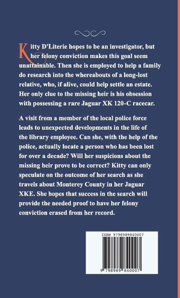 Kitty D'Literie hopes to be an investigator, but her felony conviction makes this goal seem unattainable. Then she is employed to help a family do research into the whereabouts of a long-lost relative, who, if alive, could help settle an estate. Her only clue to the missing heir is his obsession with possessing a rare Jaguar XK 120-C racecar. A visit from a member of the local police force leads to unexpected developments in the life of the library employee. Can she, with the help of the police, actually locate a person who has been lost for over a decade? Will her suspicions about the missing heir prove to be correct? Kitty can only speculate on the outcome of her search as she travels about Monterey County in her Jaguar XKE. She hopes that success in the search will provide the needed proof to have her felony conviction erased from her record.