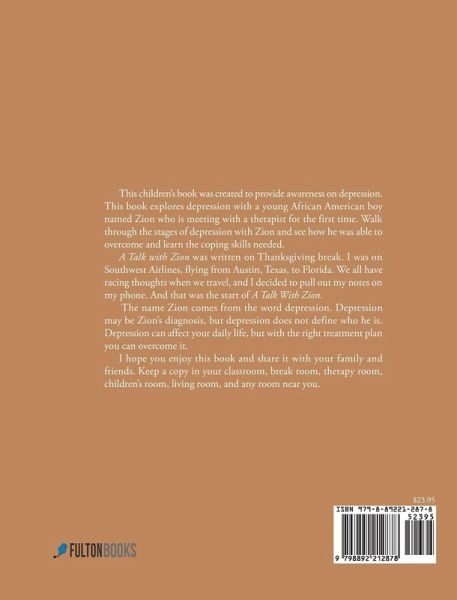 This children's book was created to provide awareness on depression. This book explores depression with a young African American boy named Zion who is meeting with a therapist for the first time. Walk through the stages of depression with Zion and see how he was able to overcome and learn the coping skills needed. A Talk with Zion was written on Thanksgiving break. I was on Southwest Airlines, flying from Austin, Texas, to Florida. We all have racing thoughts when we travel, and I decided to pull out my notes on my phone. And that was the start of A Talk With Zion. The name Zion comes from the word depression. Depression may be Zion's diagnosis, but depression does not define who he is. Depression can affect your daily life, but with the right treatment plan you can overcome it. I hope you enjoy this book and share it with your family and friends. Keep a copy in your classroom, break room, therapy room, children's room, living room, and any room near you.