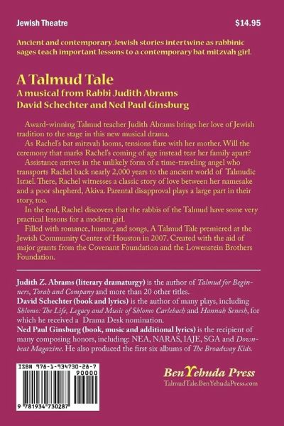 Award-winning Talmud teacher Judith Abrams brings her love of Jewish tradition to the musical stage in this new musical drama. Rachel's bat mitzvah is nearing, and fights with her mother are heating up. Will the ceremony marking Rachel's coming of age instead tear apart her family? Assistance comes from an unlikely source: a friendly time-traveling angel who transports Rachel nearly 2,000 years to the ancient world of Talmudic Israel. There, a classic story of love and parental disapproval plays out between Rachel's ancient namesake and a poor shepherd, Akiva. In the end, Rachel discovers that the ancient Talmud has some very practical lessons for a modern girl.