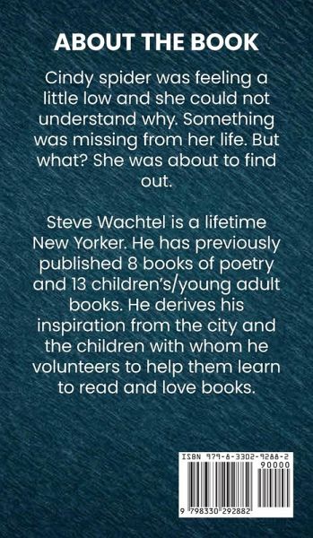 Cindy Spider was feeling a little low and she could not understand why. Something was missing from her life. But what? She was about to find out. Steve Wachtel is a lifetime New Yorker. He has previously published 8 books of poetry and 7 children's books. He derives his inspiration from the city and the children with whom he volunteers to help them learn to read and love books.