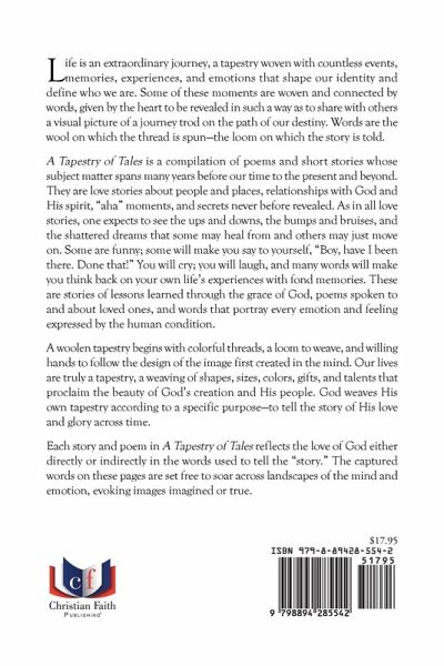 Life is an extraordinary journey, a tapestry woven with countless events, memories, experiences, and emotions that shape our identity and define who we are. Some of these moments are woven and connected by words, given by the heart to be revealed in such a way as to share with others a visual picture of a journey trod on the path of our destiny. Words are the wool on which the thread is spun--the loom on which the story is told. A Tapestry of Tales is a compilation of poems and short stories whose subject matter spans many years before our time to the present and beyond. They are love stories about people and places, relationships with God and His spirit, "aha" moments, and secrets never before revealed. As in all love stories, one expects to see the ups and downs, the bumps and bruises, and the shattered dreams that some may heal from and others may just move on. Some are funny; some will make you say to yourself, "Boy, have I been there. Done that!" You will cry; you will laugh, and many words will make you think back on your own life's experiences with fond memories. These are stories of lessons learned through the grace of God, poems spoken to and about loved ones, and words that portray every emotion and feeling expressed by the human condition. A woolen tapestry begins with colorful threads, a loom to weave, and willing hands to follow the design of the image first created in the mind. Our lives are truly a tapestry, a weaving of shapes, sizes, colors, gifts, and talents that proclaim the beauty of God's creation and His people. God weaves His own tapestry according to a specific purpose--to tell the story of His love and glory across time. Each story and poem in A Tapestry of Tales reflects the love of God either directly or indirectly in the words used to tell the "story." The captured words on these pages are set free to soar across landscapes of the mind and emotion, evoking images imagined or true.